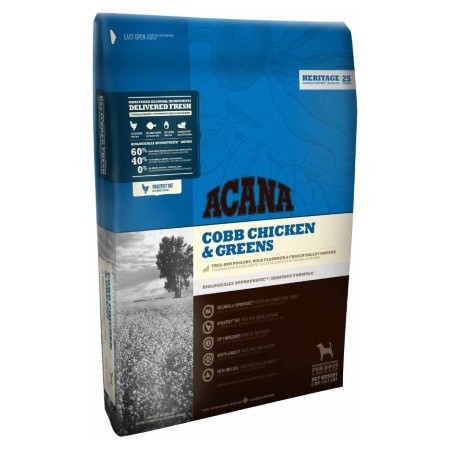 Alimento per cani adulti di tutte le taglie ed età. Acana Heritage Cobb Chicken & Greens è ricco di ingredienti freschi provenienti esclusivamente da fornitori locali, come pollo allevato a terra, uova deposte in nido, pesce pescato in natura e verdura maturata al sole.