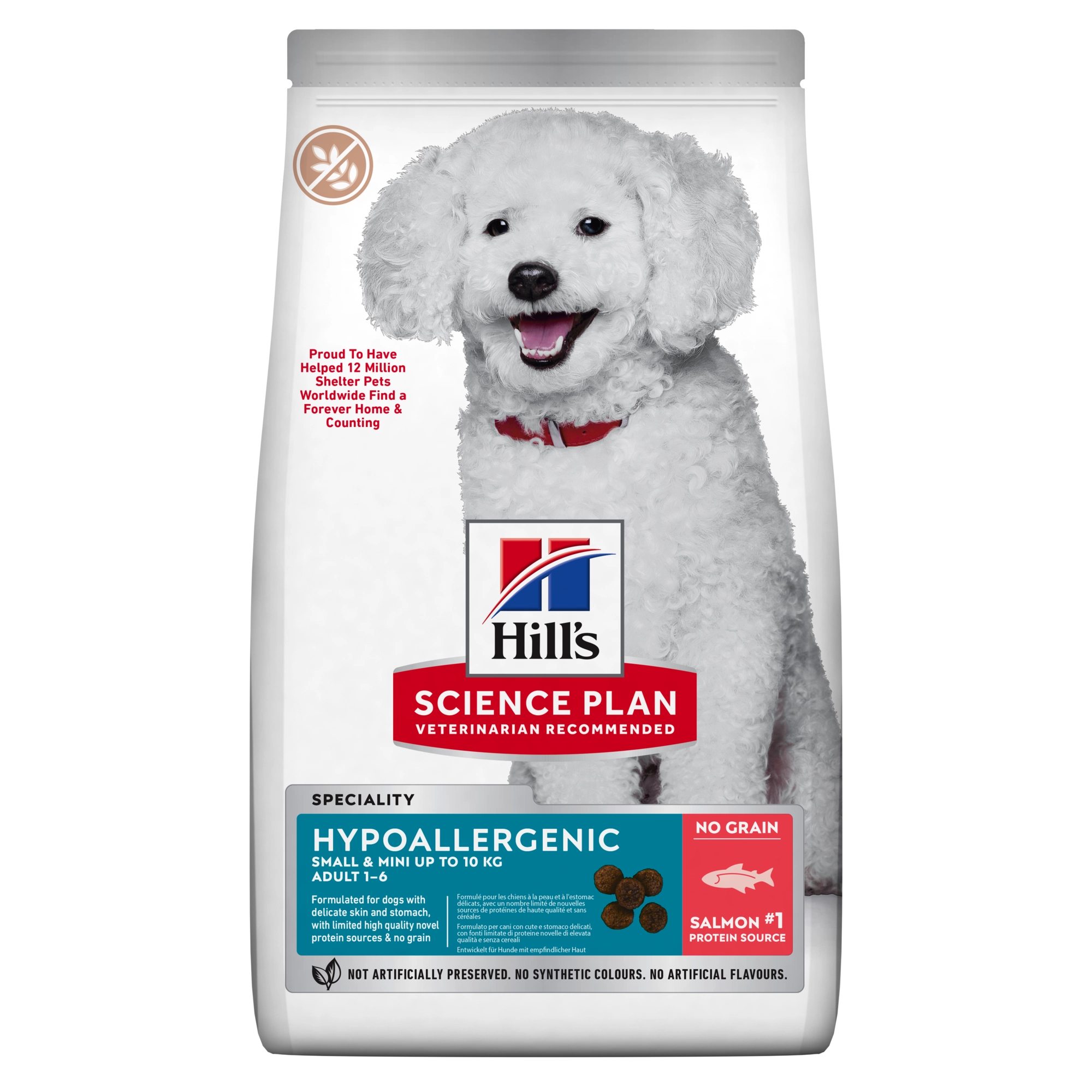Hill's Science Plan Hypoallergenic Adult Small&Mini alimento secco per cani al Salmone è completo e di grande gusto per cani adulti di piccola taglia di età compresa tra 1 e 6 anni. È un alimento ipoallergenico per cani sensibili, con limitate fonti di proteine nuove di alta qualità e senza cereali.