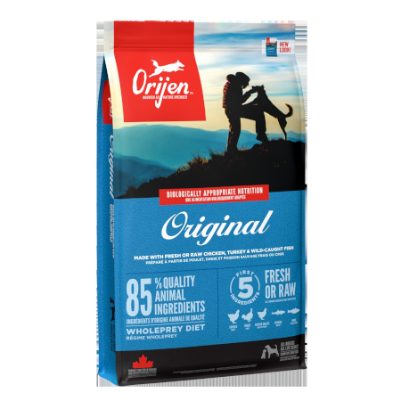 Orijen Original contiene l’85% di ingredienti animali di alta qualità freschi o crudi** , come pollo, tacchino e pesce pescato in natura o allevato in modo sostenibile.