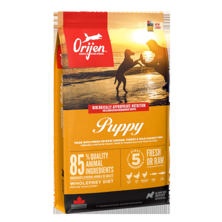 Orijen Puppy ha un'elevata percentuale di proteine derivante da tanta carne fresca: i cani sono per natura carnivori, il loro breve tratto digerente è adatto per alimenti a base di carne, ricchi di proteine e poveri di carboidrati. I cani sono in grado di sfruttare in maniera ottimale le proteine come fonte energetica. Solo un alimento a base di carne garantisce al vostro amico una salute di ferro. Attuali ricerche hanno infatti dimostrato che un'elevata percentuale di proteine animali ha effetti positivi anche per i reni. Le crocchette per cani Orijen Puppy contengono tante proteine ad alta digeribilità e almeno il 70% tra carne e pesce freschi di alta qualità: