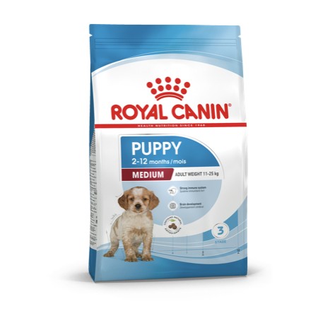 Royal Canin Medium Puppy è un alimento completo e bilanciato appositamente formulato per soddisfare i fabbisogni nutrizionali dei cuccioli di taglia media (peso da adulto tra 11 e 25 kg) sino al raggiungimento dei 12 mesi di età. Contribuisce allo sviluppo delle difese naturali del cucciolo grazie ad un complesso scientificamente provato, tra cui vitamina C ed E. È arricchito con un acido grasso omega-3 (DHA) dimostrato scientificamente per supportare lo sviluppo cerebrale del cucciolo e favorire l’apprendimento precoce. Una combinazione di prebiotici (MOS) e proteine altamente digeribili favorisce l’equilibrio del microbiota intestinale a supporto della salute digestiva. Le crocchette di ROYAL CANIN® Medium Puppy sono pensate per favorire la prensione ed incoraggiare la masticazione. L’azione meccanica esercitata dalla crocchetta sul dente, proprio durante la masticazione, favorisce l’igiene orale contribuendo alla salute dentale. Al raggiungimento dei 12 mesi di età, il cucciolo di taglia media avrà bisogno di un alimento appositamente formulato per soddisfare i fabbisogni nutrizionali legati all’età adulta. Per questo periodo ROYAL CANIN® propone Medium Adult, un alimento completo e bilanciato disponibile secco (crocchette) e umido (bocconcini in salsa).
