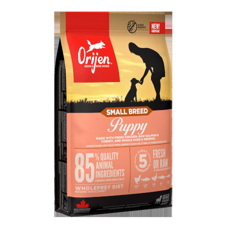 Preparato con l’85% di ingredienti animali di alta qualità tra cui pollo fresco, salmone e tacchino crudi, nasello atlantico e aringa interi crudi, l’alimento Orijen Small Breed Puppy è specificamente formulato per rispondere alle esigenze nutrizionali dei cuccioli di taglia piccola.