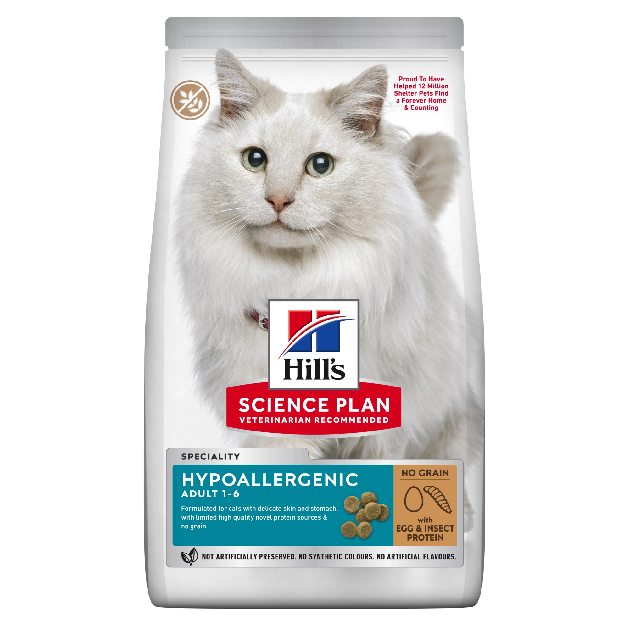 Hill's Science Plan Hypoallergenic Adult alimento secco per gatti con Uova e Proteine degli Insetti è un alimento completo e di grande gusto per gatti adulti da 1 a 6 anni. È un alimento ipoallergenico per gatti sensibili, con limitate fonti di proteine animali di alta qualità e senza cereali.