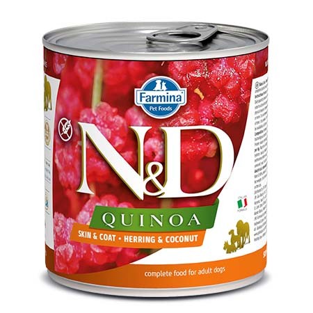 Alimento completo per cani adulti. N&D Quinoa Skin & Coat - Herring & Coconut è un alimento dietetico completo per cani, consigliato per la riduzione di intolleranze a ingredienti e sostanze nutritive.