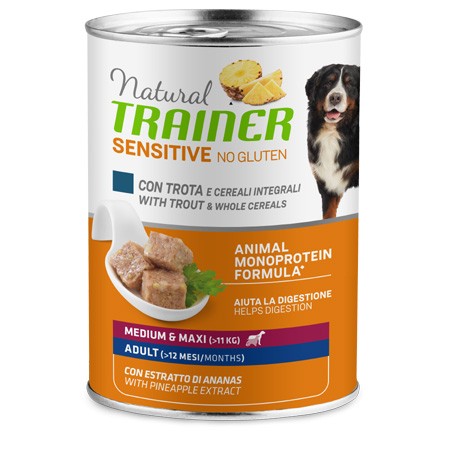 Alimento completo monoproteico per cani adulti taglia media e grande (più di 10kg. di peso) da 1 a 7 anni di età. L’utilizzo di trota come unica fonte proteica di origine animale e di cereali integrali come unica fonte di carboidrati, lo rende particolarmente indicato per soggetti predisposti alla sensibilità alimentare. È un alimento che non contiene glutine di frumento.