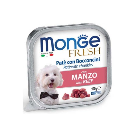 Monge Superpremium Fresh Paté e Bocconcini per cani ha un cuore di prelibati bocconcini con carne fresca selezionata, senza coloranti, conservanti e grassi idrogenati e a basso tenore di zuccheri, per offrire al tuo Fido il benessere quotidiano di cui ha bisogno e per essere sempre in forma.