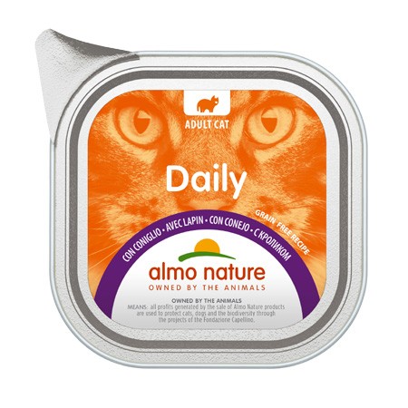 Alimento umido per gatti gustoso e altamente digeribile. Almo Nature Daily con coniglio è costituito da ingredienti naturali di altissima qualità, in origine dichiarati idonei al consumo umano. Privo di conservanti e additivi, è disponibile nelle comode vaschette da 100 gr.