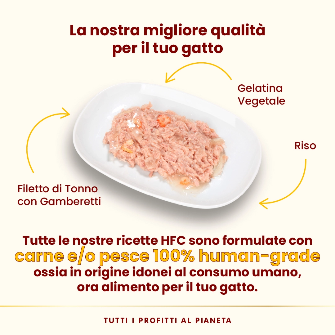 Brodo di tonno, filetto di tonno 40%, gamberetti 4%, riso 1%.