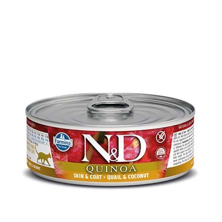 Alimento umido a base di quaglia per gatti adulti. N&D Quinoa Skin & Coat è un alimento dietetico completo per gatti, consigliato per la riduzione di intolleranze a ingredienti e sostanze nutritive.