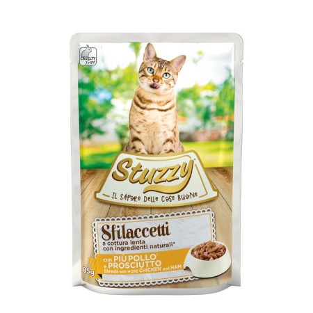 Offri al tuo gatto una ricetta completa sfiziosa e nutriente con gli Sfilaccetti con Pollo e Prosciutto di Stuzzy: un imperdibile mix di sapori, con gustosi ingredienti naturali e una lenta cottura per esaltarne la bontà.