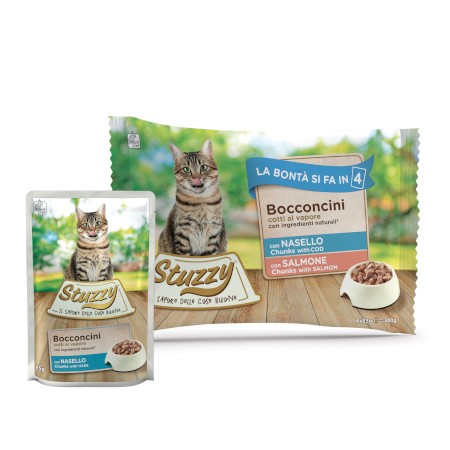Scegli il multipack di Stuzzy con i Bocconcini con Nasello e i Bocconcini con Salmone per il tuo gatto. Sono alimenti completi, con ingredienti naturali cotti al vapore… e hanno tutto il gusto del pesce per sentirgli fare le fusa di piacere.