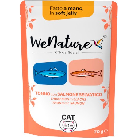 Alimento umido per gatti adulti a base di tonno con salmone in soffice gelatina, creato con i migliori ingredienti che la natura offre, nel rispetto dell'ambiente. Formulato con materie prime selezionate: genuine, semplici e naturali. Il tuo inseparabile amico rimarrà soddisfatto dalla bontà e dal gusto.