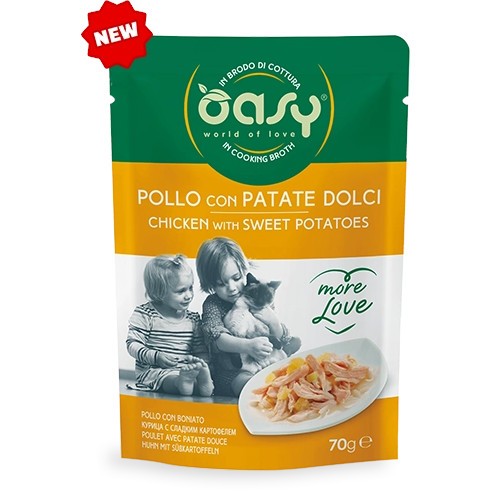 Gustosi straccetti di pollo con patate dolci, preparati in brodo di cottura, senza coloranti, aromatizzanti e conservanti artificiali. Una bontà tutta naturale da offrire al tuo gatto adulto ogni giorno. Formulato senza glutine, OGM e soia.