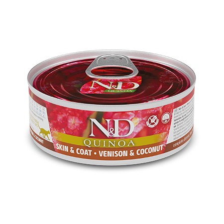 Alimento umido a base di cervo e cocco per gatti adulti. N&D Quinoa Skin & Coat è un alimento dietetico completo per gatti, consigliato per la riduzione di intolleranze a ingredienti e sostanze nutritive.