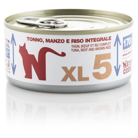 70%tonno, 2,5% carne di manzo, 1% riso integrale, acqua di cottura pari al 26,50% della ricetta.