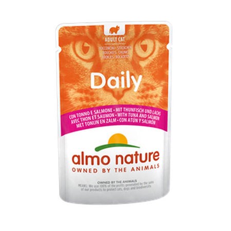 Alimento umido per gatti gustoso e altamente digeribile. Almo Nature Daily al tonno e salmone è costituito da carne e sottoprodotti scelti. I bocconcini, cucinati in salsa, sono completamente naturali. Con gelatina naturale ad alta appetibilità che aiuta a contrastare la formazione dei boli di pelo.