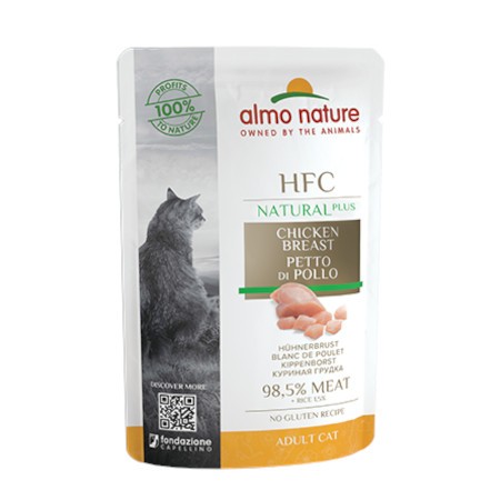 Nella gamma Almo Nature HFC Cat NaturalPLUS trovano spazio 7 ricette, equamente ripartite tra ingredienti di terra e di mare, disponibili in pouch monoporzione da 55g. Almo Nature HFC Cat NaturalPLUS è un alimento complementare: per un equilibrio nutrizionale ottimale, Almo Nature consiglia di servire al gatto una ricetta HFC Cat NaturalPLUS a base di ingredienti di terra e una di mare ogni giorno, integrando con una piccola quantità di crocchette di alta qualità come HFC Dry.