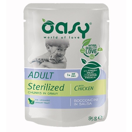 - I Bocconcini in salsa Oasy Adult Sterilized sono un alimento completo per gatti adulti castrati o sterilizzati.