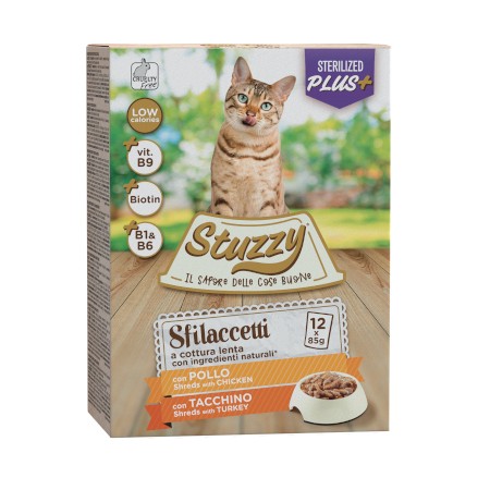 Per la nutrizione del tuo gatto sterilizzato, scegli il multipack di Stuzzy con gli Sfilaccetti al Pollo e gli Sfilaccetti al Tacchino. Gustose ricette complete, preparate con squisiti ingredienti naturali a cottura lenta. Impossibile resistere!