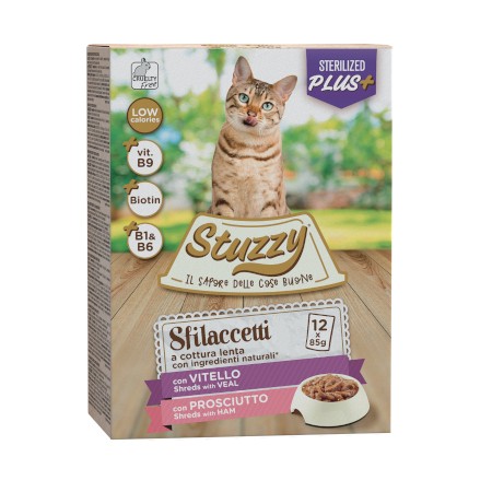 Sfilaccetti con Vitello o Sfilaccetti con Prosciutto? Se il tuo gatto sterilizzato non sa scegliere, questo multipack di Stuzzy fa per te. Contiene squisiti alimenti completi, preparati con ingredienti naturali attentamente selezionati e cotti lentamente. Il tuo amico felino li adorerà!