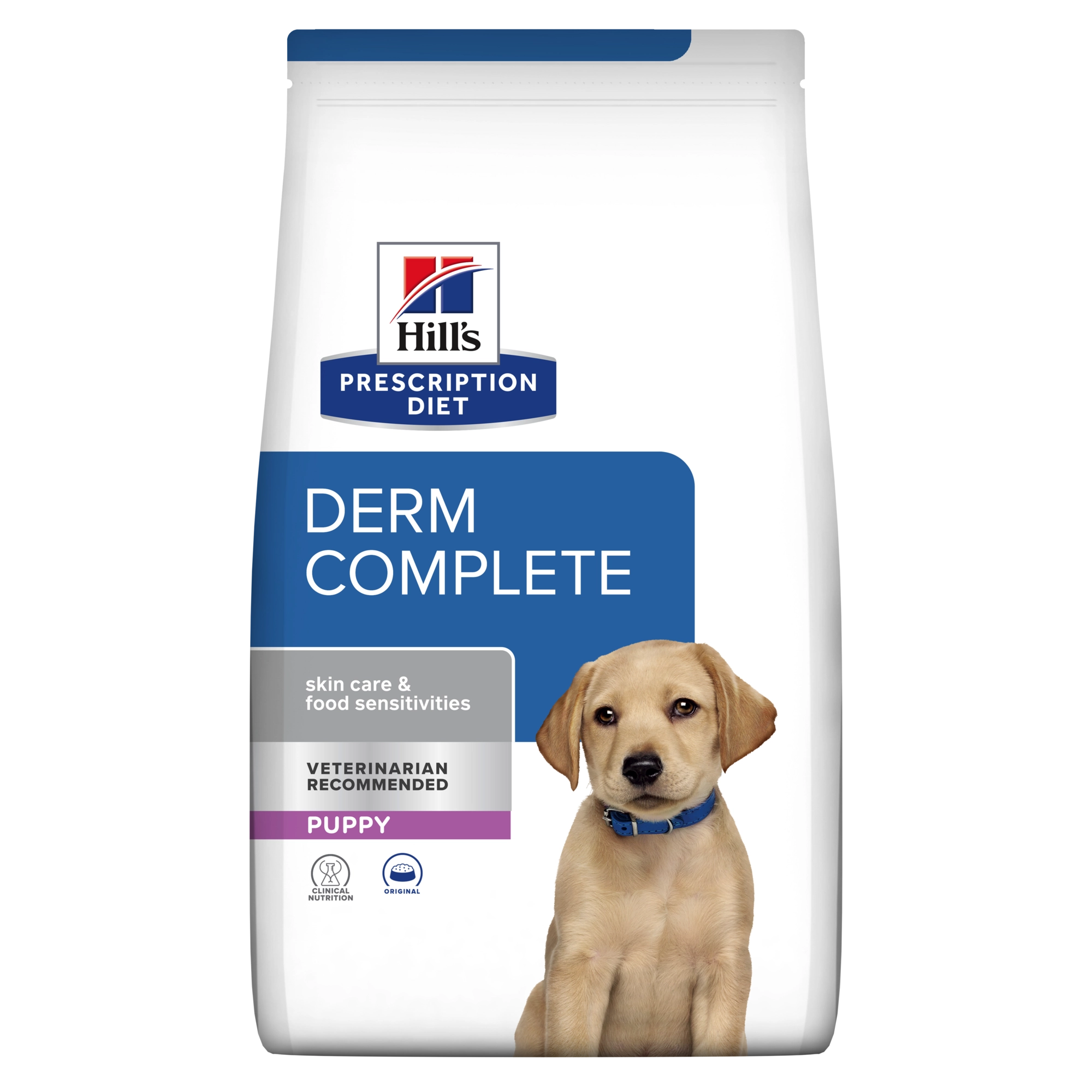 Prescription Diet Derm Complete Puppy è appositamente formulato per sostenere la salute cutanea e gestire le sensibilità alimentari e ambientali nei cuccioli.