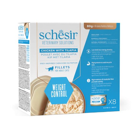 Schesir Veterinary Solutions Weight Control è un alimento dietetico completo ed equilibrato per gatti adulti, formulato per la riduzione dell'eccesso di peso corporeo.