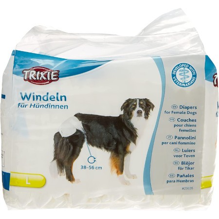 I pannolini sono sagomati per adattarsi al corpo del cane e hanno l'apertura per la coda. La tenuta è garantita dalle larghe chiusure adesive su entrambi i lati. Ogni confezione contiene 12 pannolini.