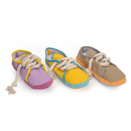 Divertente e colorato gioco per cani nella forma di una scarpa in poliestere con squeaker e lacci in corda.
