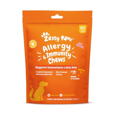 Supporto immunitario a prova di Fido! Nutri il benessere della pelle del tuo cane con i nostri Zesty Paws Allergy & Immunity Chews, scientificamente formulati, sostengono la normale funzione immunitaria e la salute della pelle del tuo cane.