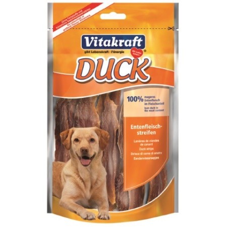 Snack masticativo ideale per spezzare la fame fra un pasto e l'altro e per appagare il palato dell'animale grazie ad una gustosissima carne di anatra. Le strisce di carne di anatra sono prodotte con pura carne fresca, senza aggiunta di zucchero, soia, cereali, uova, latticini, farine di carne, coloranti ed esaltatori di sapidità artificiali. Indicato per cani adulti a partire da 1 anno di vita.