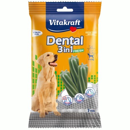 Spesso i cani soffrono di problemi dentali, come la formazione del tartaro, e di alito cattivo. Una regolare pulizia dentale è quindi molto importante per prevenire tali problemi. I deliziosi bastoncini dentali Dental 3in1 Fresh, arricchiti con prezioso olio alla menta per un alito fresco e senza zucchero, contengono un‘efficace combinazione di principi attivi. La sostanza Stay Clean™ riduce lo sviluppo dei batteri responsabili della formazione della placca. I pirofosfati aggiunti simolano il calcio presente nella saliva e riducono la formazione del tartaro. La componente dello zinco previene la gengivite e contribuisce a sanare le lesioni della bocca. La speciale forma a stella a 6 punte e la consistenza elastica dei bastoncini dentali Dental 3in1 consente una profonda pulizia dei denti grazie all'azione meccanica e agevola la rimozione di placca e tartaro. Inoltre il loro gusto particolarmente aromatico li rende una vera e propria delizia. Questi snack vengono prodotti rinunciando all'aggiunta di zucchero, di coloranti e aromi artificiali e di antiossidanti.