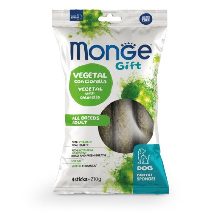 Monge Gift Dental Sponges vegetal con clorella è un alimento complementare per cani adulti di tutte le taglie. Specificatamente sviluppato per il benessere del tuo cane grazie all’inclusione di fibra vegetale per una maggiore elasticità di texture e favorire la masticazione.