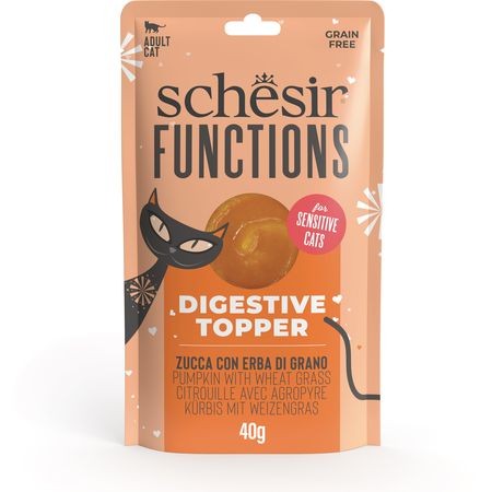 Topper funzionale supplementare, dalla ricetta semplice e la consistenza gradevole, a base di zucca frullata con aggiunta di erba di grano, per supportare i gatti con la digestione delicata.